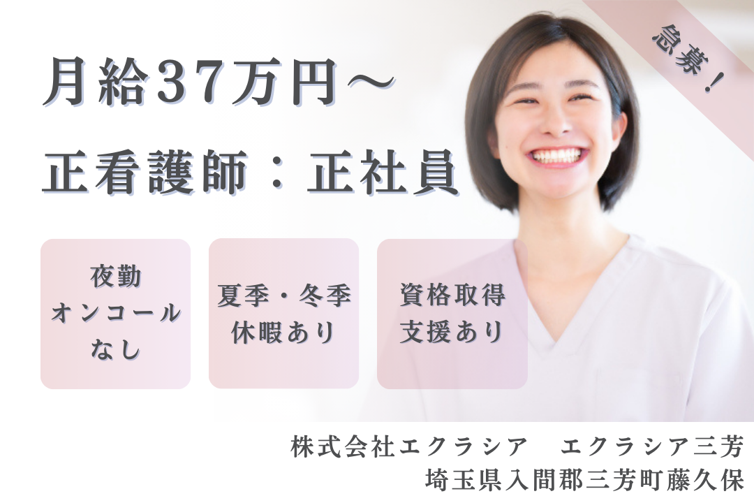 夜勤もオンコールも一切ナシ!/夏季・冬季休暇あり☆/月37万円〜/研修制度や資格取得支援制度あり◎