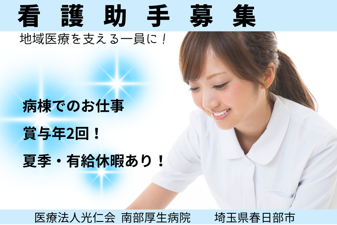 埼玉県春日部市の総合病院で \ 病棟看護助手さんを募集しています!/ ▼ 病棟での介護業務 ┗ 入院患者さまの身の回りのお世話 ┗ 食事・入浴・トイレ・着替えなどの介助 ┗ 看護師のサポート業務 など |