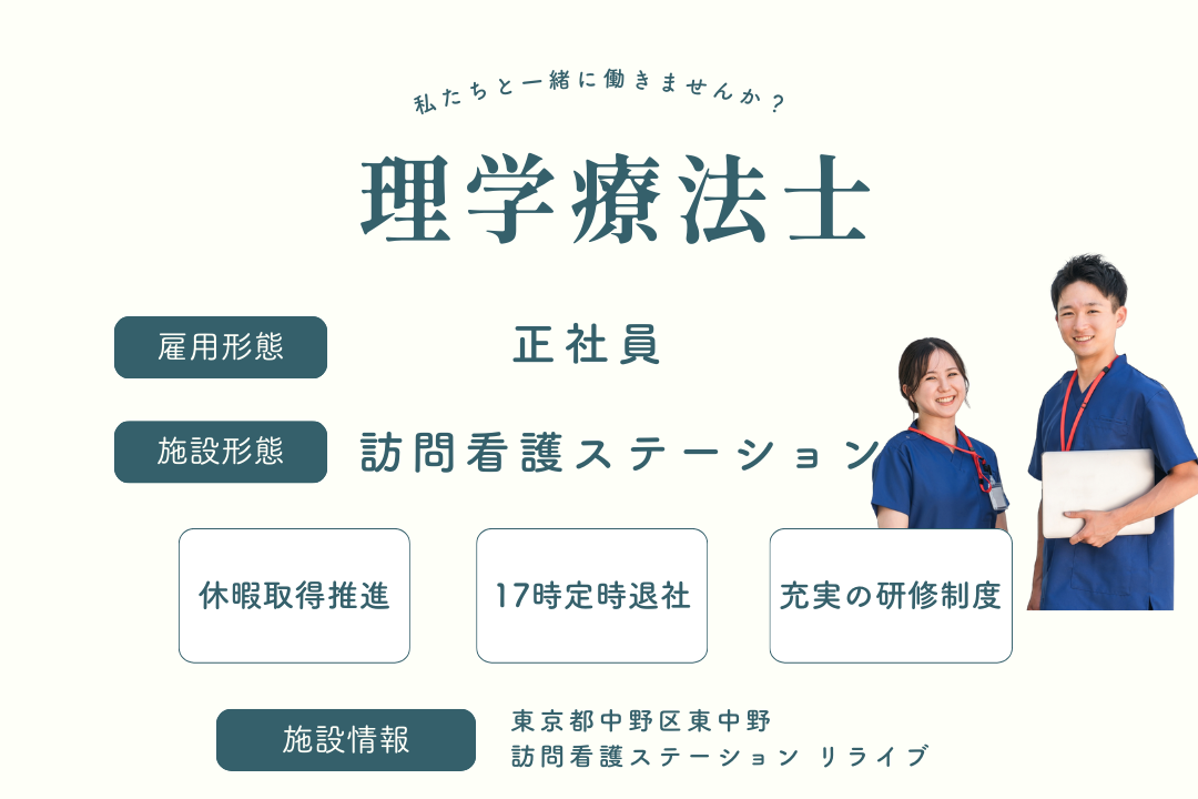 〈必須〉 ■理学療法士(必須) ※病院や医療機関での臨床経験5年以上(必須) ※訪問業務未経験でも、意欲がある方歓迎 ※18歳以上(深夜業務を含むため:省令例外事由2号) 土日に勤務できる方歓迎! |