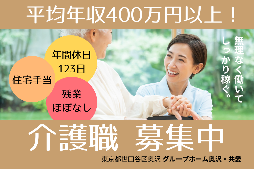 年間休日123日◎/残業ほぼなし/介護職の平均年収400万円以上☆/賞与は例年3ヶ月分/手当充実