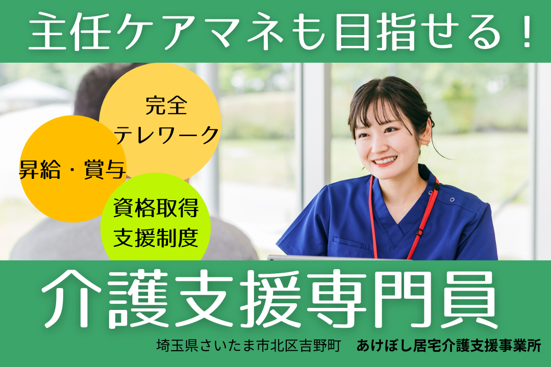 ケアプランの作成や給付管理、 サービス事業者との調整や連携など、 ケアマネージャー業務を担当していただきます。 *リモートワーク・テレワークでの勤務です! スマートフォン、タブレット貸与あり。 |