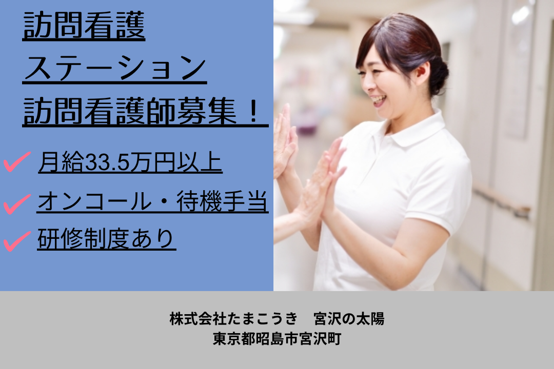 【具体的なお仕事内容】 ご利用者様が住み慣れたご自宅で、安心して 生活できるようにケアしております。 ・病状や障害の観察と看護 ・清潔、栄養摂取、排泄のケア ・医療機器の管理や操作援助 ・認知症や精神疾患の方への看護 ・ターミナルケア ・ご家族への支援 ・その他状況に応じた必要とされる看護援助 ※移動には軽自動車を使用します |